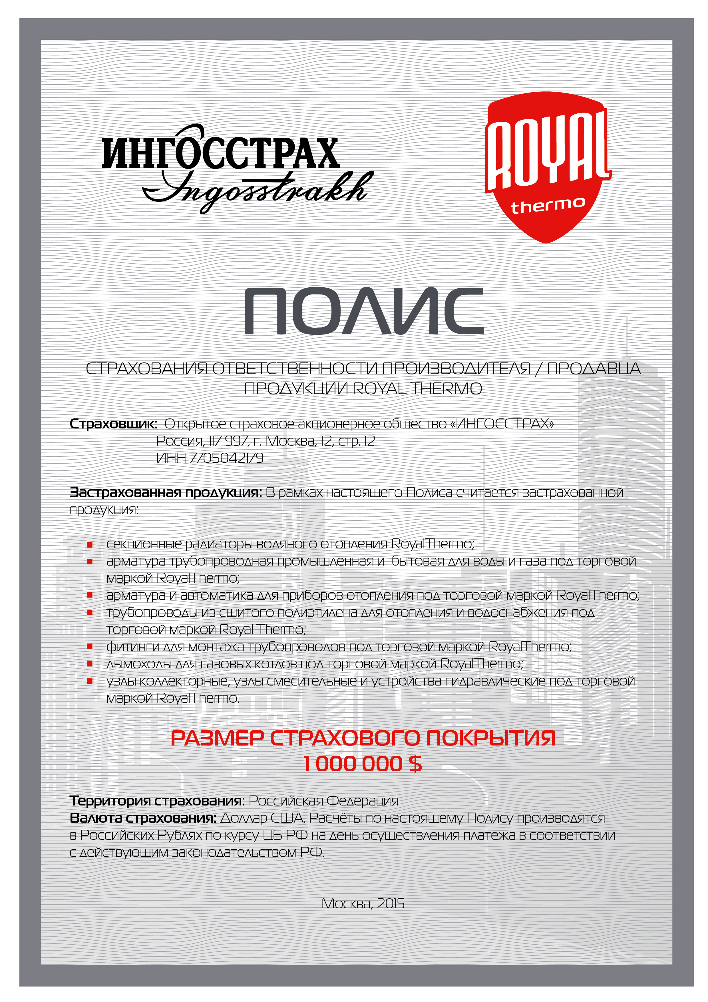 Беспрецедентный размер страхового покрытия 1 000 000$ на всю продукцию Royal Thermo от ОАО «Ингосстрах» обеспечивает Вашу защиту и спокойствие в течение всего срока службы.